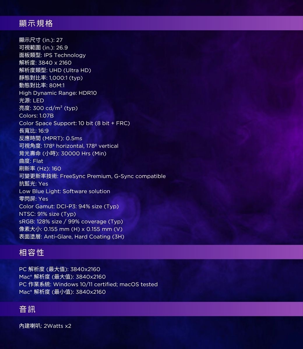 | 特殊功能 | 抗藍光, 護眼, 廣視角, 窄邊框, 零閃屏, HDR, 電競 |