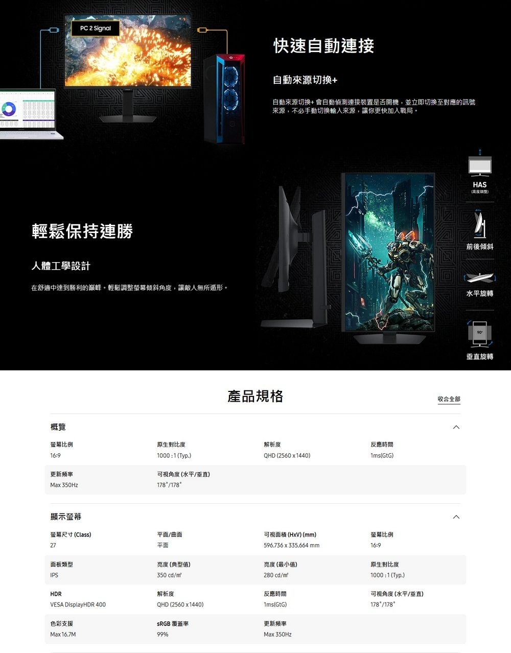 | 特殊功能 | 零閃屏, 抗藍光, 左右旋轉, 窄邊框, HDR, 2K |