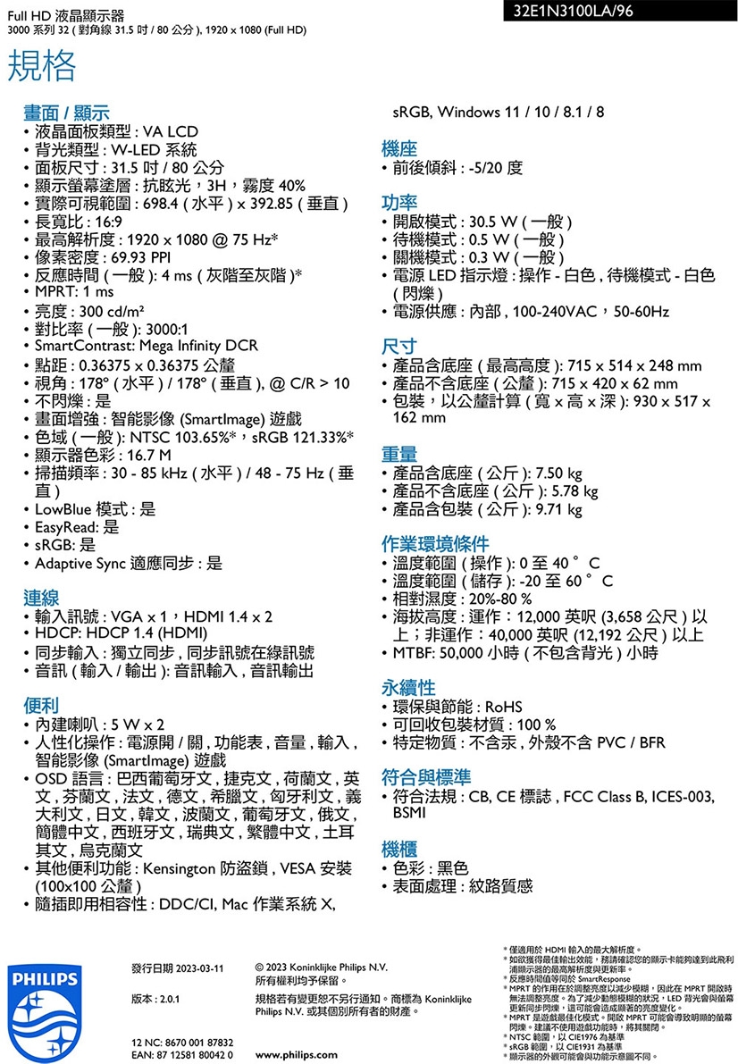 | 訊號輸入介面 | HDMI, D-Sub(VGA) |