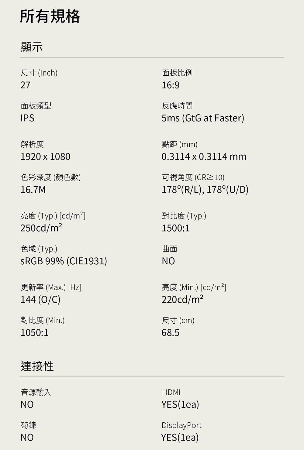 | 螢幕尺寸(吋) | 27吋 |