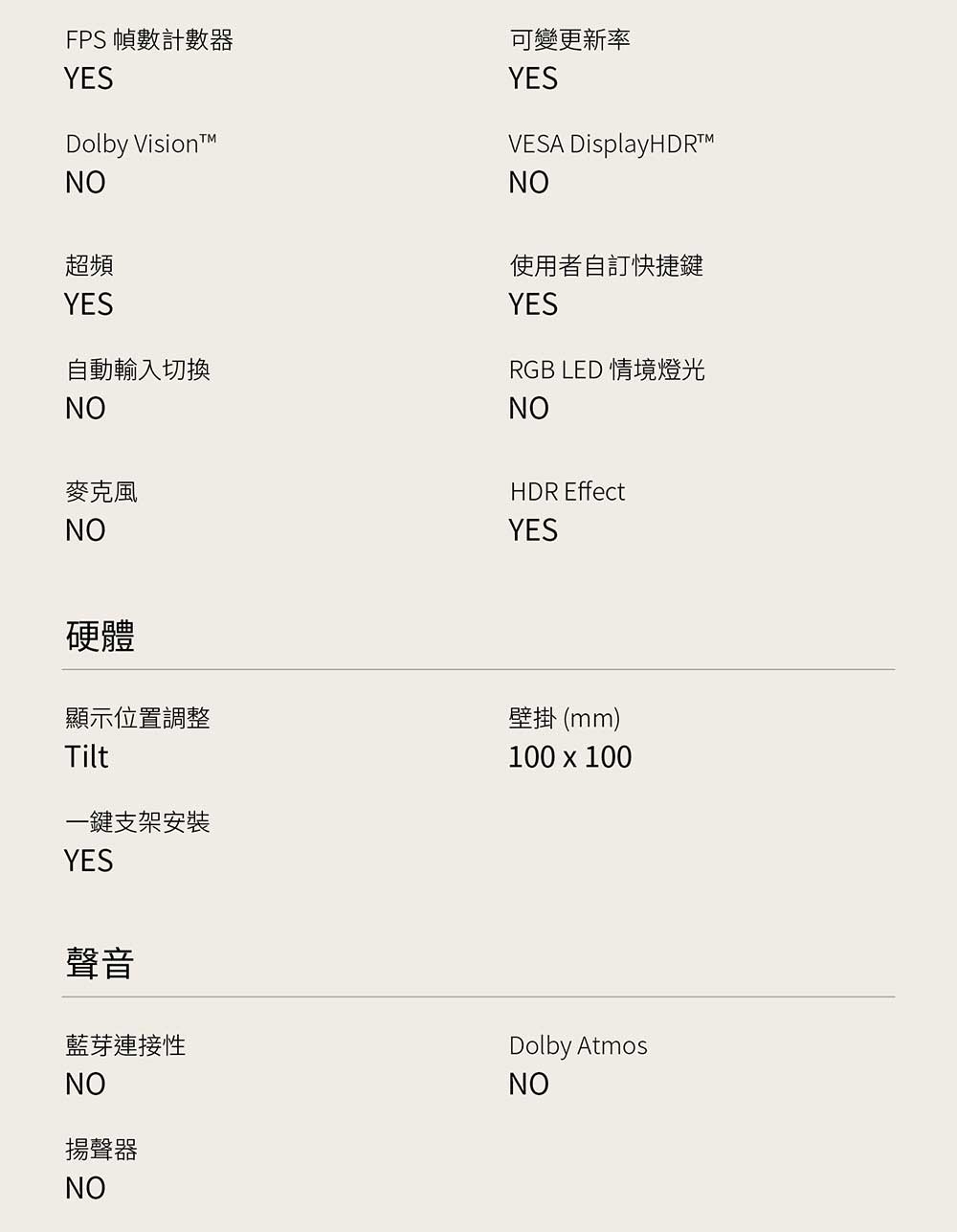 | VESA壁掛 | 有壁掛洞 |
