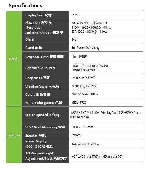 | 特殊功能 | 廣視角, 窄邊框, 護眼, 左右旋轉 |