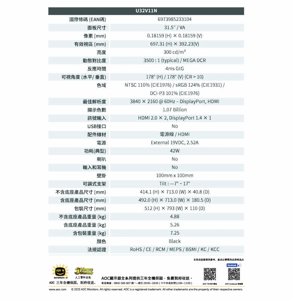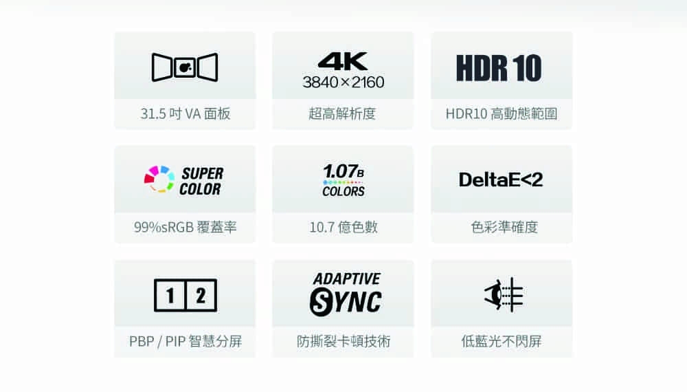 | 特殊功能 | HDR, 抗藍光, 電競, 護眼, 4K, 零閃屏, 窄邊框 |