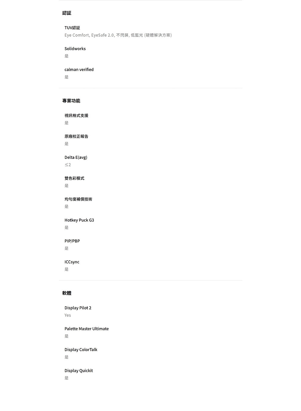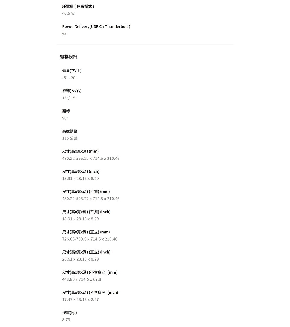 | 特殊功能 | 4K, 專業型, 90度樞軸旋轉, 左右旋轉 |