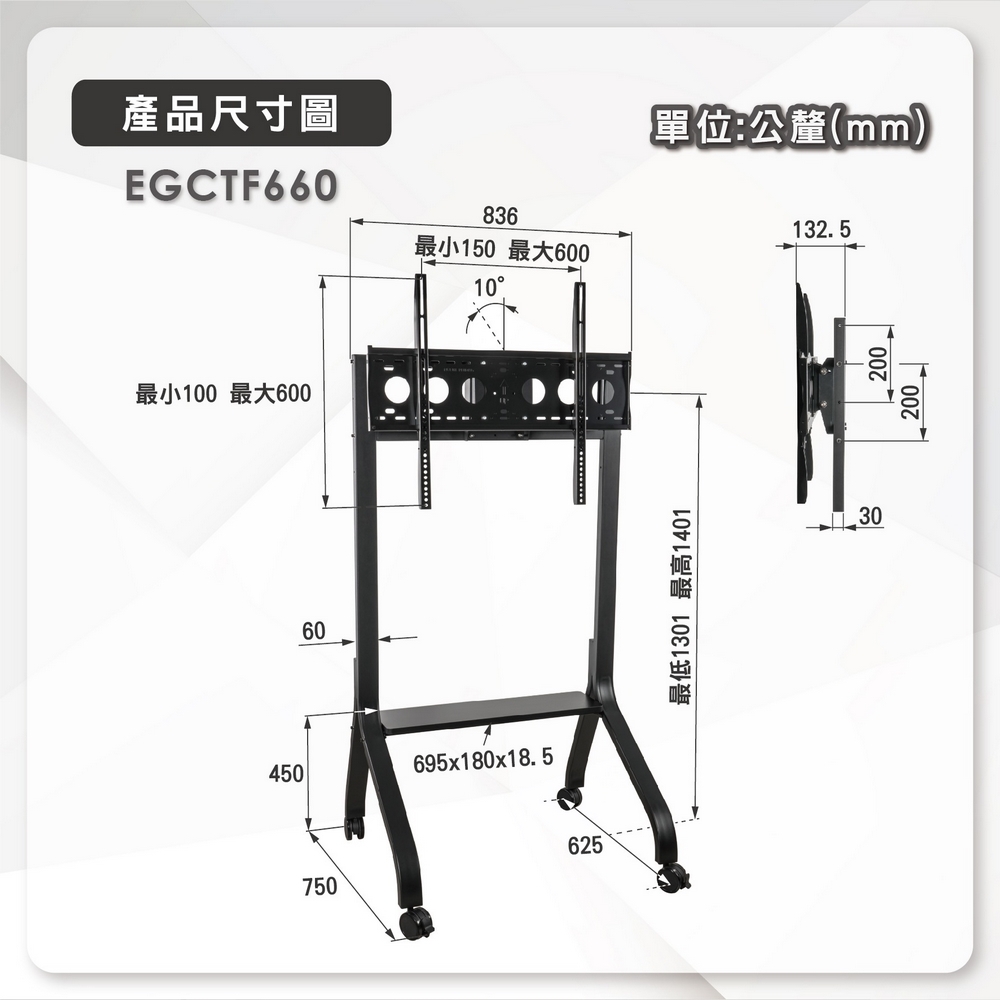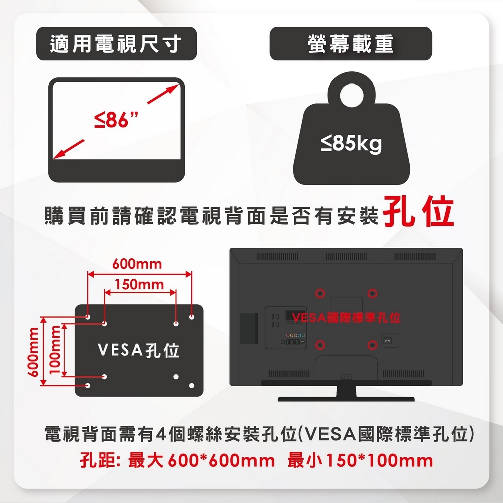 | 最大承載重量 | 螢幕載重:≦85KG |