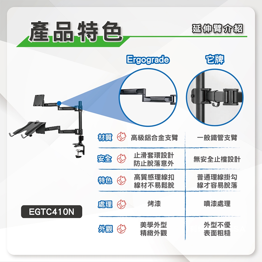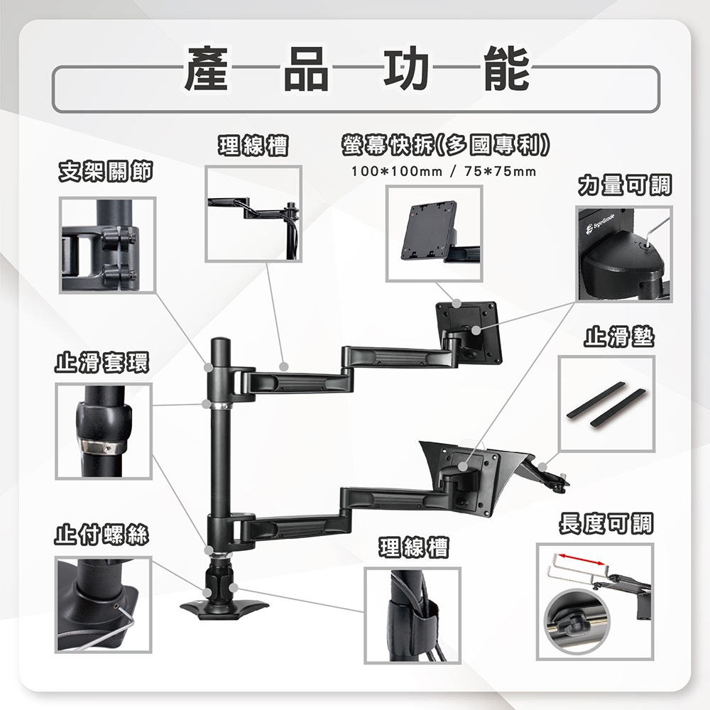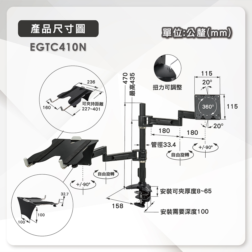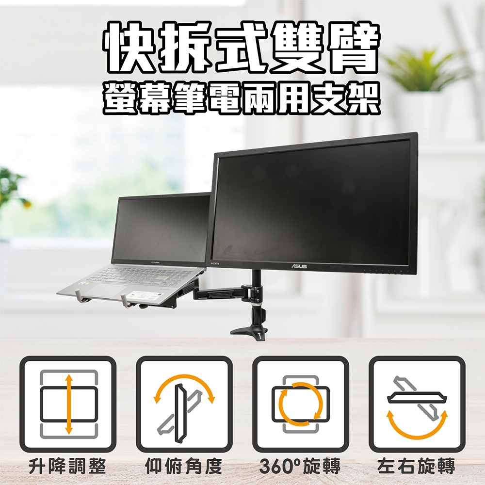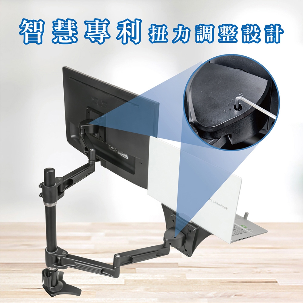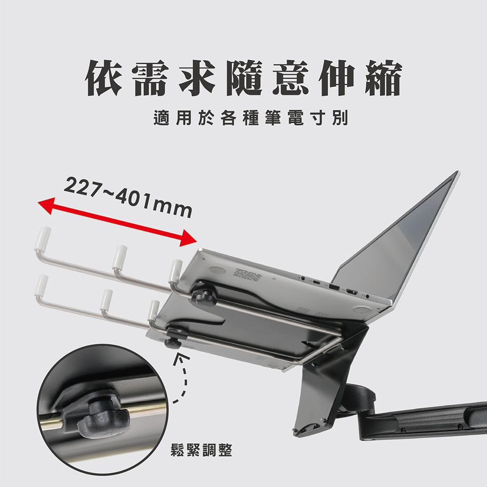 | 最大承載重量 | 螢幕載重2~8KG/筆電托載重≤5.5KG |