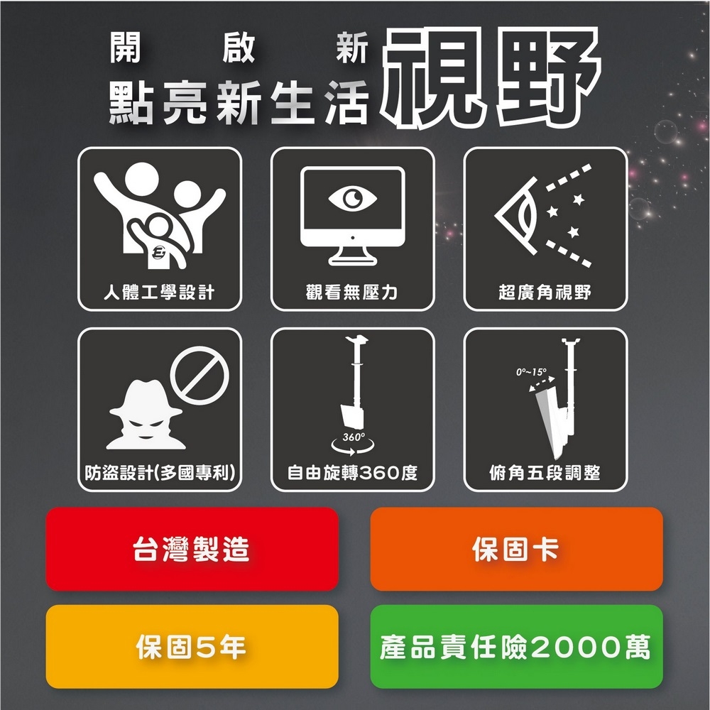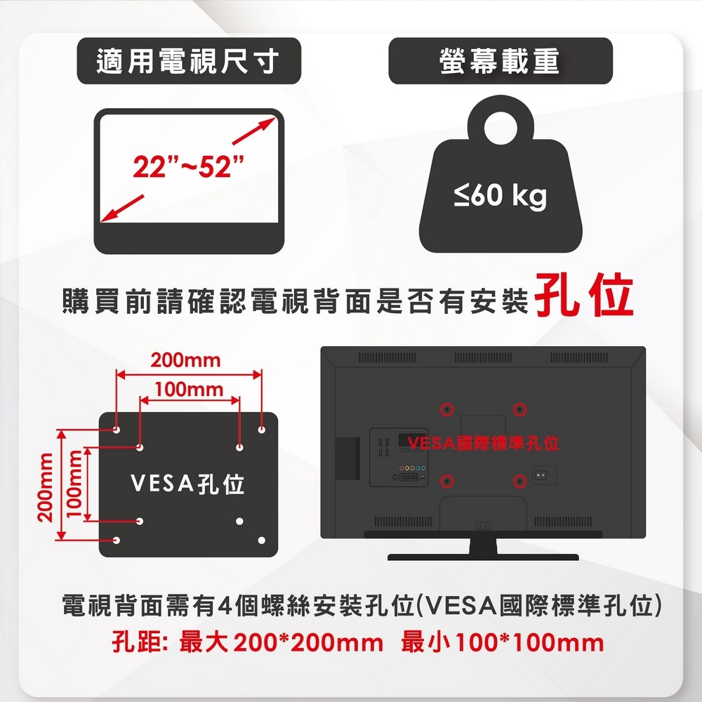 | 適用螢幕尺寸 | 22吋, 23吋, 23.6吋, 24吋, 25吋, 27吋, 28吋, 29吋, 32吋, 34吋, 35吋, 40吋, 50吋 |