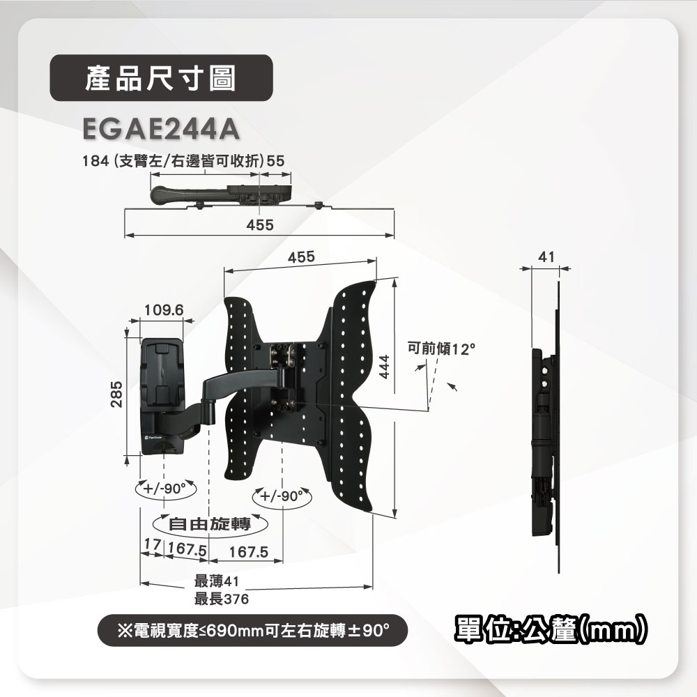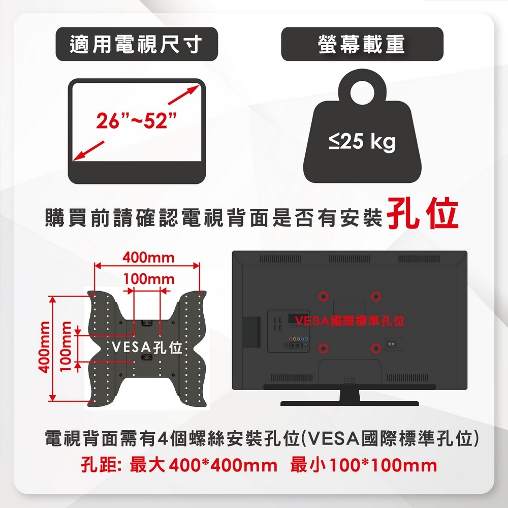 | 最大承載重量 | 螢幕載重:25kg |