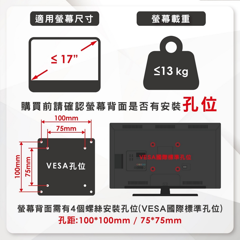 | 最大承載重量 | 螢幕載重13KG |