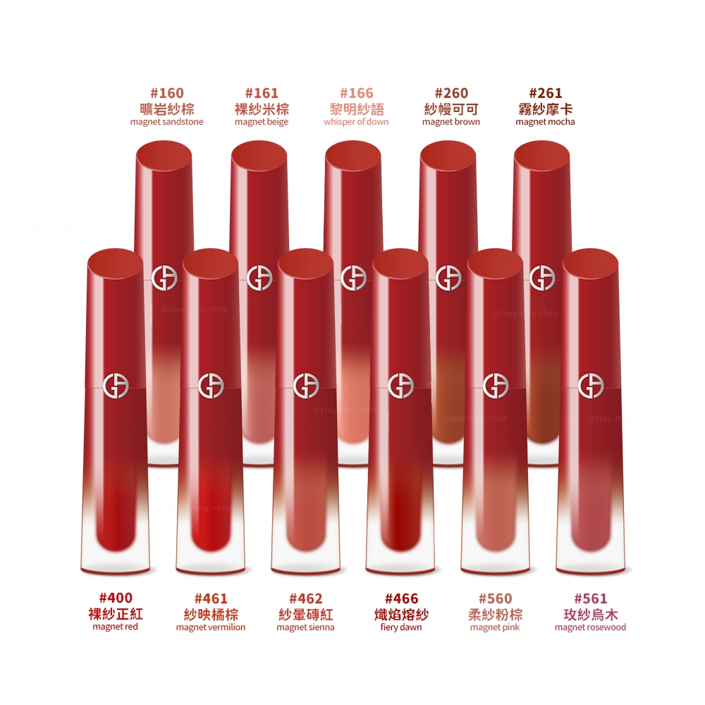 | 色號 | 160 曠岩紗棕, 161 裸紗米棕, 166 黎明紗語, 260 紗幔可可, 261 霧紗摩卡, 400 裸紗正紅, 461 紗映橘棕, 462 紗暈磚紅, 466 熾焰熔紗, 560 柔紗粉棕, 561 玫紗烏木 |
