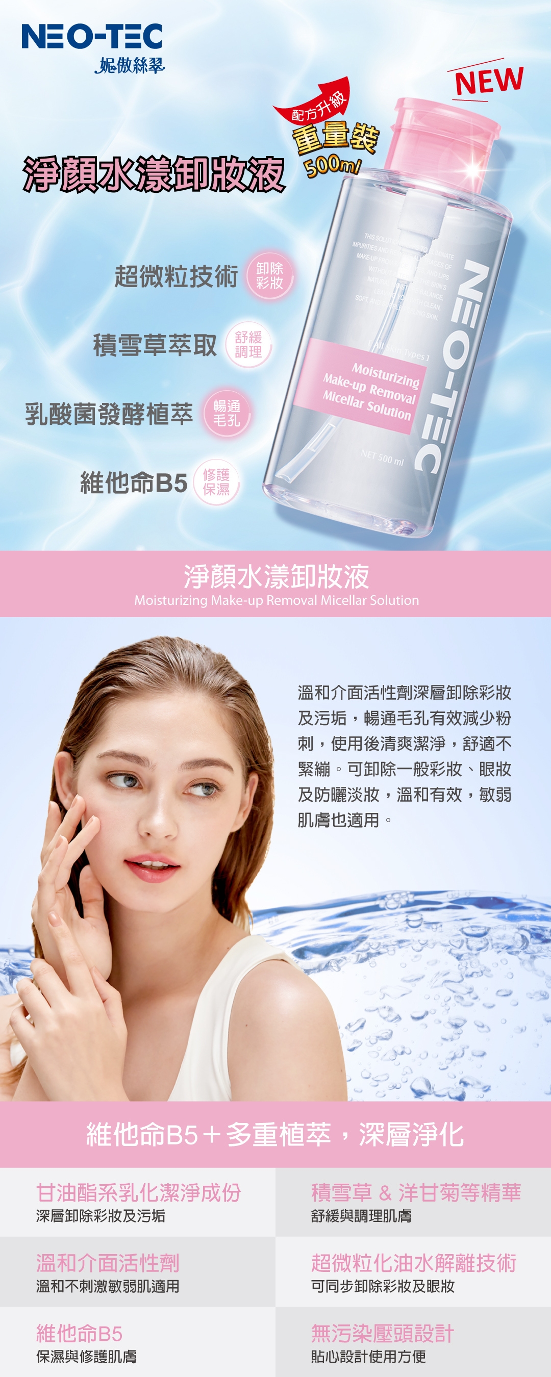 | 商品名稱 | (58折)NEO-TEC 妮傲絲翠 淨顏水漾卸妝液500ml(重量裝)+物理性潤色防曬霜SPF50 |