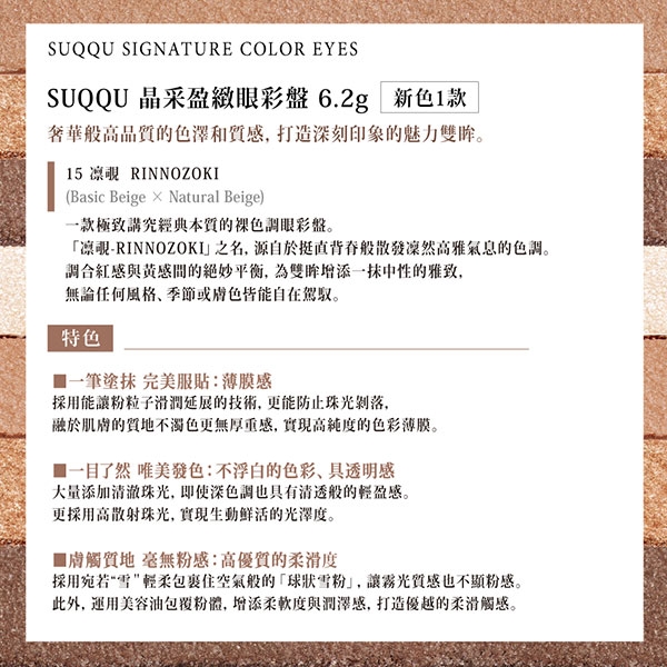| 規格/容量 | 組合內含: <br/>1.SUQQU 晶采盈緻眼彩盤 6.2g(多色任選)<br/>2.贈品:SUQQU 晶采妍色眉筆液 0.6mL(隨機精選色)(效期:2026/07) |