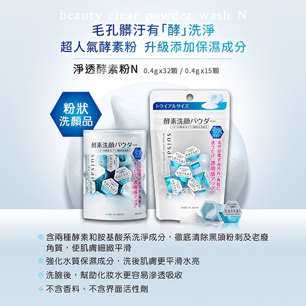 | 規格/容量 | 組合內含:<br/>1.以下2款任選1款<br/>-淨透酵素粉N 0.4gx15顆x4包<br/>-酵素粉x3顆<br/>或<br/>-黑炭泥淨透酵素粉 0.4gx15顆x4包<br/>-黑炭酵素粉x3顆<br/>2.贈品:suisai 碳酸泡泡毛孔淨透洗顏粉 32包(正貨/價值$930) |