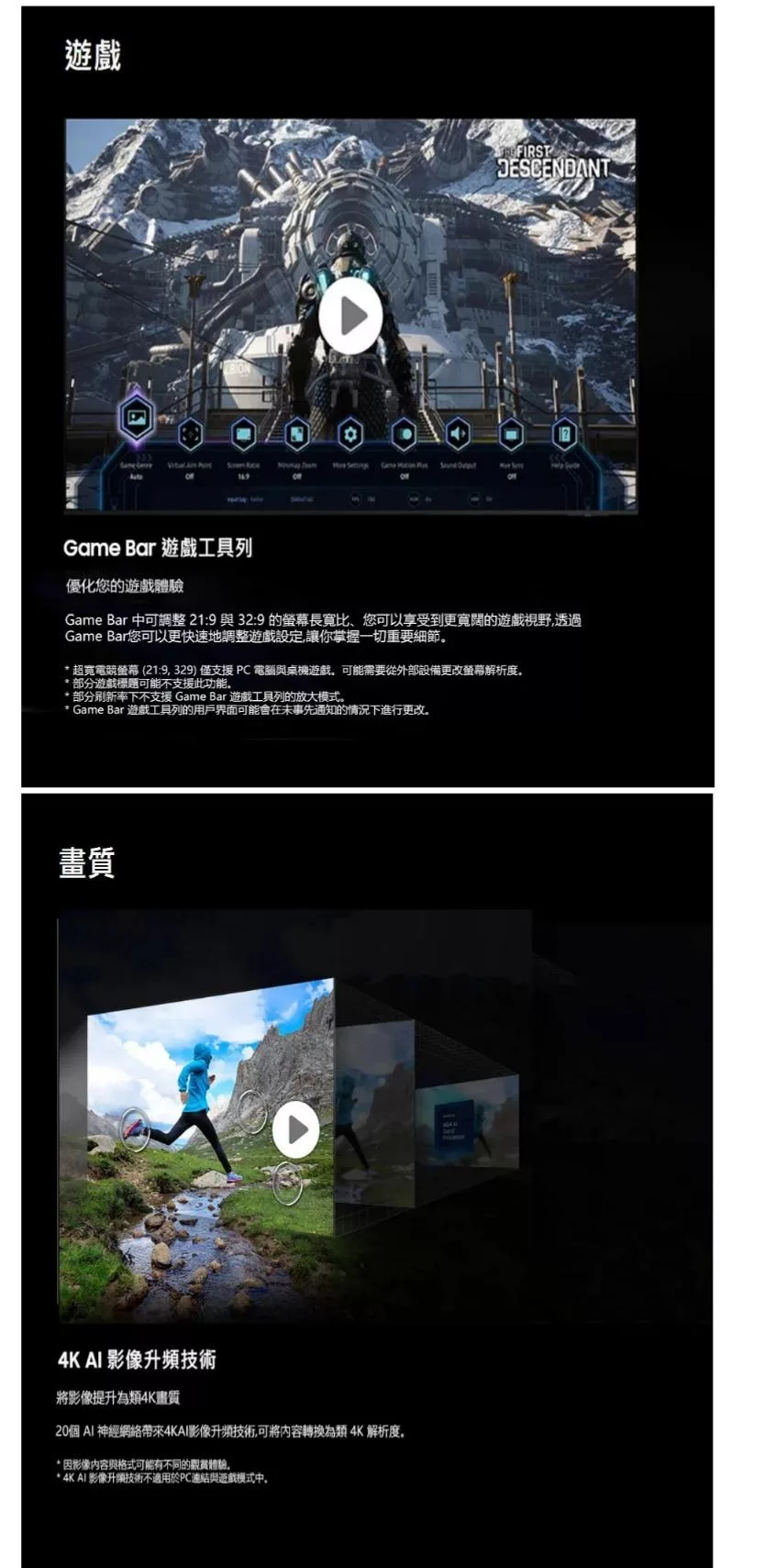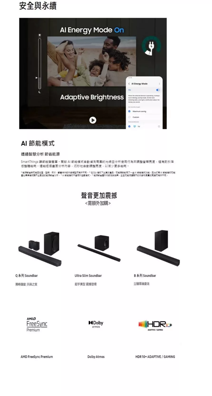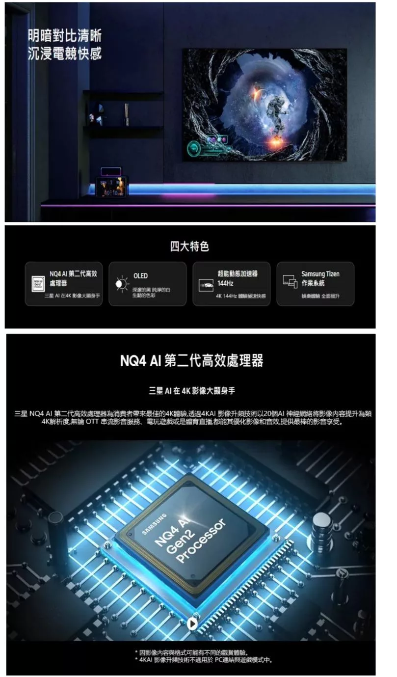 裝置具備 Samsung Vision AI 技術,提升影像與影片細節,支援 4K UHD 解析度,提供更清晰的視覺體驗。內建智慧功能,可串聯多種裝置,並支援語音控制與多種串流平臺。適閤家庭娛樂與高畫質影音需求。