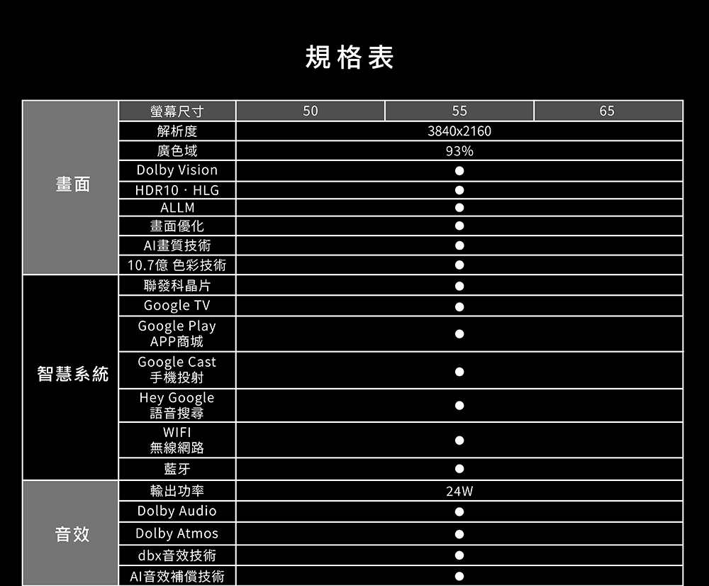 | 功能 | APP搖控,WIFI傳輸,智慧聯網,語音聲控,無線搖控,場景模式,Disney+,Netflix,YouTube,愛奇藝,手機平板鏡射,杜比音效,藍光護眼,遙控器語音,60Hz,HDR10,Dolby,Audio,Dolby,Atmos,Dolby,Vision,93% |