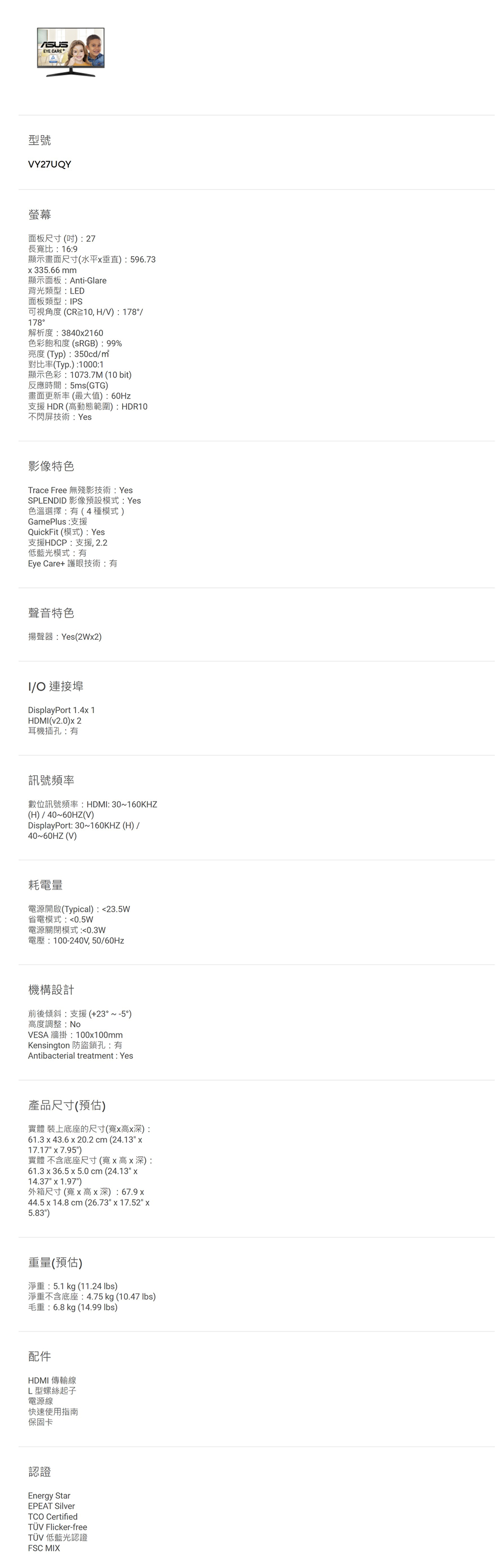 ASUS 華碩 VY27UQY 是一款27吋4K解析螢幕,採用IPS面板提供廣角視野與準確色彩表現。內建喇叭,支援HDMI與DP介面,內建Eye Care Plus技術與TÜV Rheinland不閃屏技術,有效降低藍光與閃爍,保護眼睛健康。支援VESA壁掛100x100mm,適合多種安裝需求,是小資首選的高價效比螢幕。