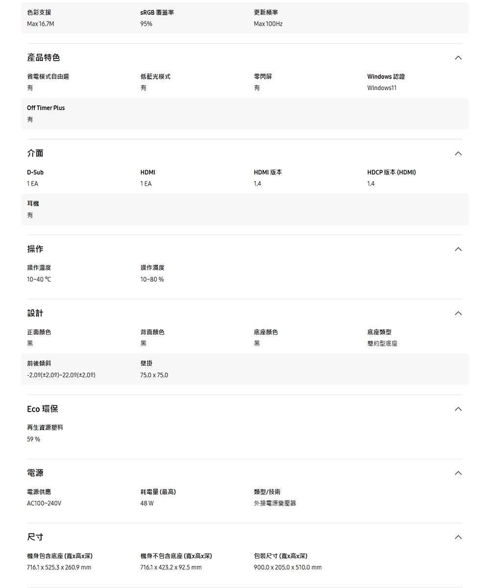 | 特殊功能 | 零閃屏, 護眼, 窄邊框, 抗藍光, HDR, 廣視角, 電競, 曲面 |
