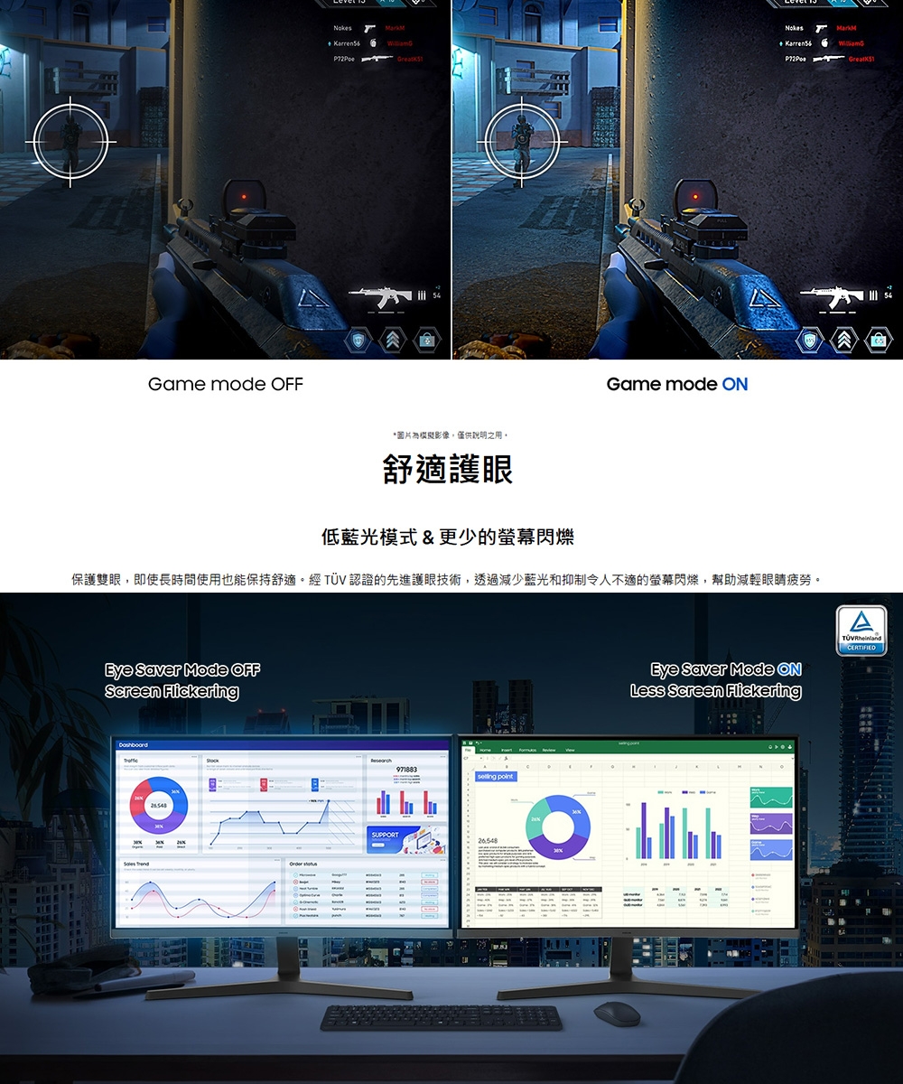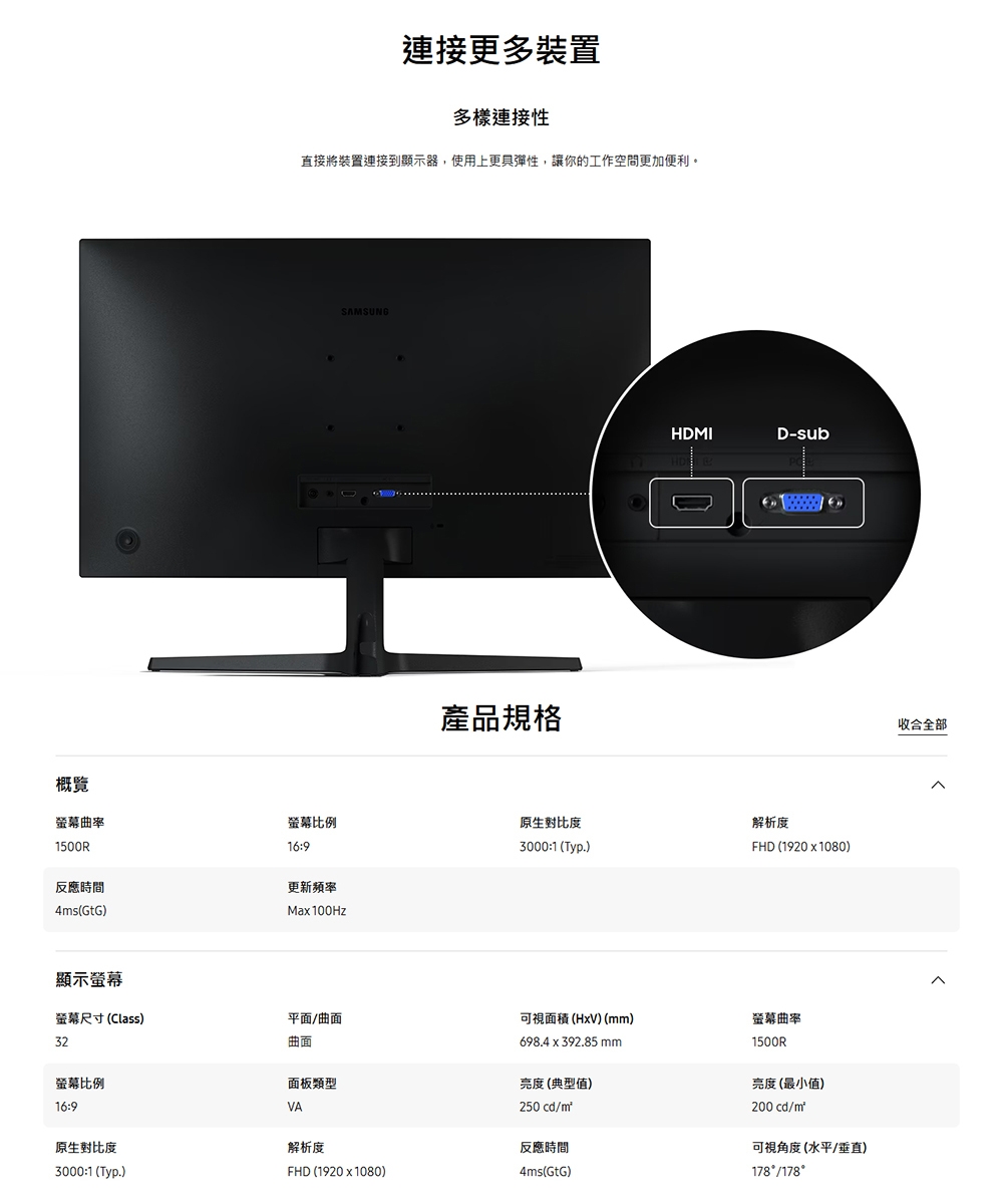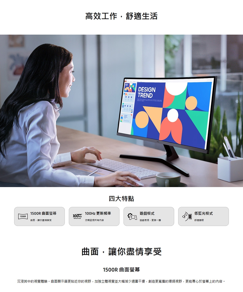 | 產品定位 | 看片/追劇首選, 學生入門款, OA辦公用CP值高, 健康護眼款, 曲面全景視覺, 電競Gamer必買 |