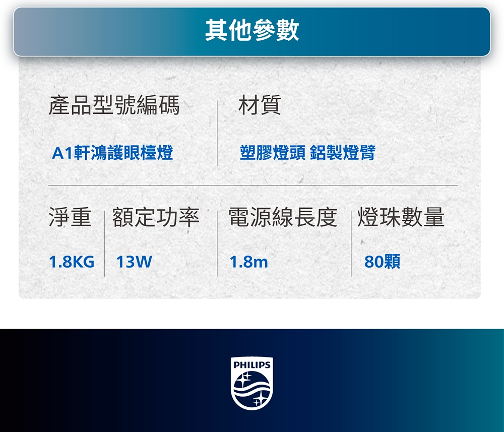 PHILIPS 飛利浦 PD062 檯燈,採用高效 LED 燈泡,提供柔和護眼照明,適合閱讀與工作。產品重量僅 1.8KG,中國製造,透過 BSMI 許可字號 R3A588 認證,享有 1 年保固。提升桌面空間的實用照明選擇,安全可靠。